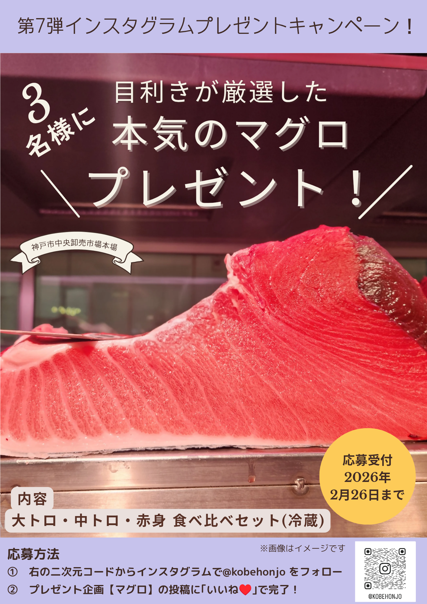 応募期間内に @kobehonjo をフォローし、投稿にいいね!をして下さった方の中から抽選で3名様に